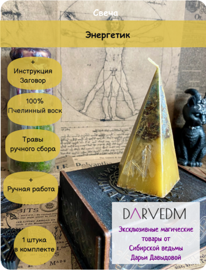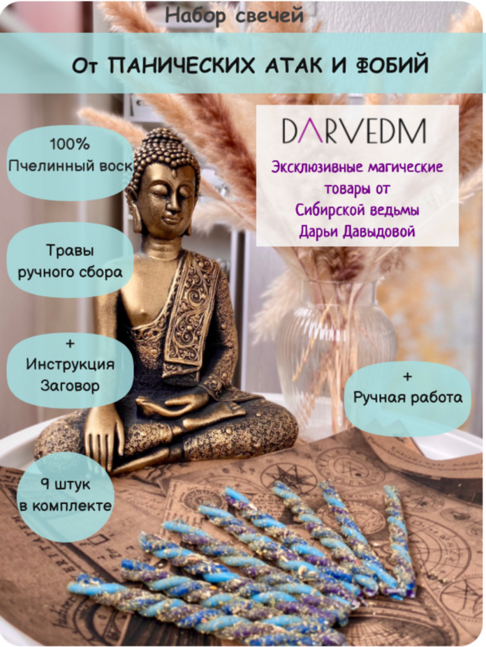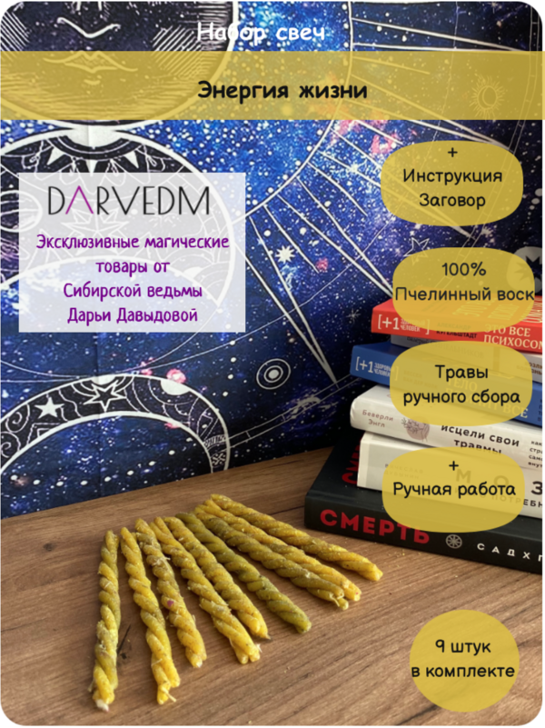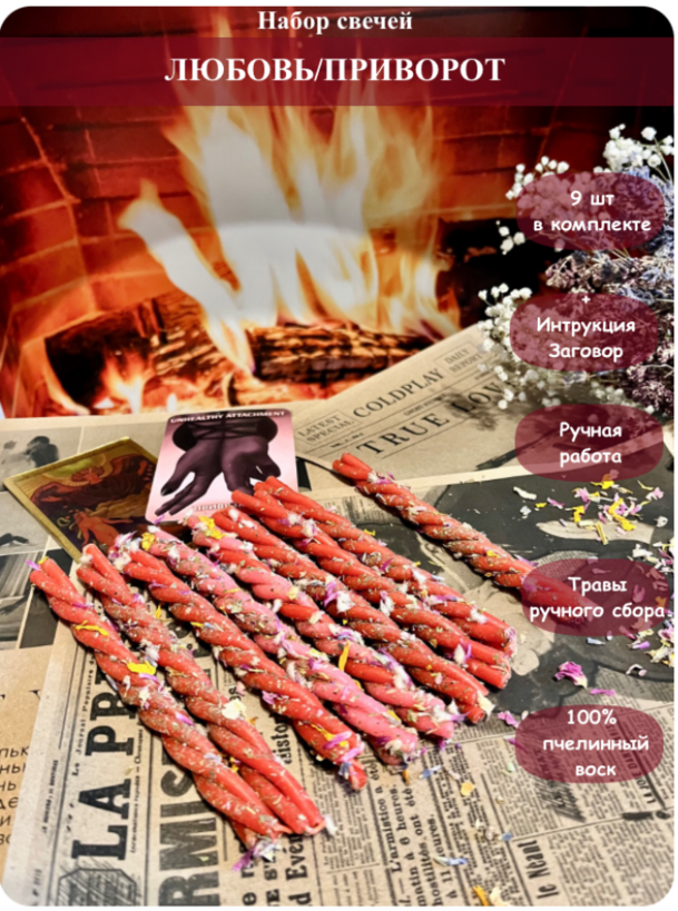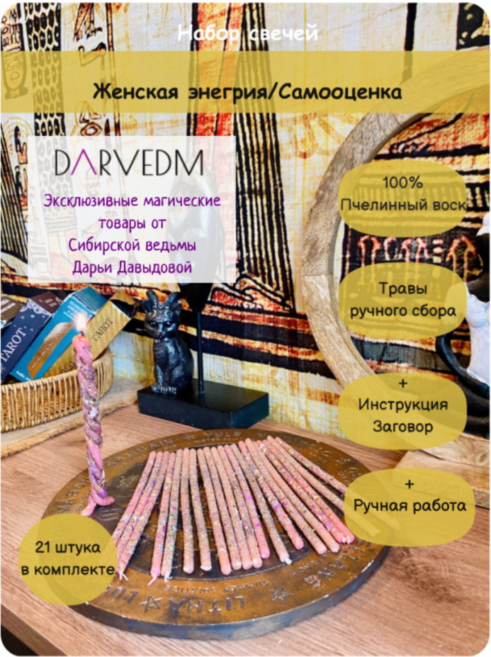 Мои свечи — это не просто воск. Это ручная работа, каждая скрутка создаётся в особом энергетическом состоянии, с подобранными под задачу травами и цветами. В каждую вложено намерение, сила и знание — это ритуальный инструмент, а не бытовой предмет.Я использую воск со своей пасеки — он чистый, живой и наделён силой природы.